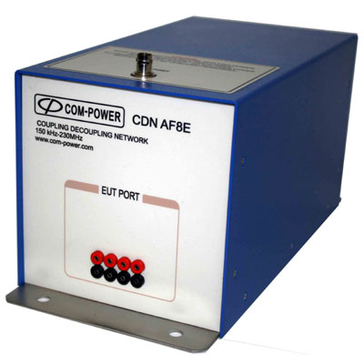 Com-Power CDN-AF8E is a member of the series of Coupling/Decoupling Networks for testing product for conducted immunity per IEC/EN 61000-4-6 and CISPR 16-1-2. CDN-AF8E is designed for testing products that uses eight wire unscreened cables for data communication.